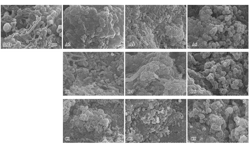 根據(jù)3.1節(jié)中的COD去除率變化選擇具有代表性的濃度組(A組:A2、A4、A6;B組:B2、B4、B6;C組:C1、C3、C5)進行各項指標的測定.圖 2為放大10000倍后的顆粒污泥的掃描電鏡圖.由圖 2可見,空白組厭氧顆粒污泥表面幾乎為8~25 μm長的桿狀菌,伴隨有少量的球菌,污泥表面凹凸不平孔隙交錯,是內(nèi)部微生物能量代謝的重要通道.在高濃度的亞硝氮、硝氮和氨氮(A6、B6和C5)作用下,厭氧顆粒污泥的表面結構都發(fā)生明顯變化,污泥表面的主要細菌由桿狀菌變?yōu)榍驙罹?,幾乎不見桿菌.低濃度抑制作用下,污泥表面主要細菌為桿菌和球狀菌,且與空白組相比桿菌比例明顯降低.