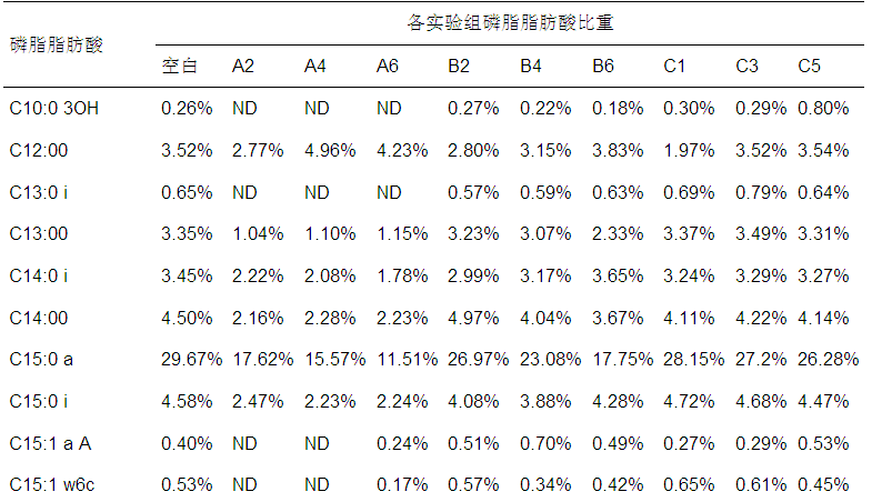 由圖 4可以看出,PC1反映了不同抑制物質(zhì)對PLFA的影響,PC2反映了不同抑制濃度對PLFA的影響.主成分分析顯示,各樣品間有較明顯的差異,A2、A4、A6、B6與空白之間的差異度較大,剩余樣品與空白之間的差異度相對較小.厭氧微生物的PLFA對亞硝氮的敏感度最高,即使低濃度的亞硝氮(A2)也會引起PLFA較大的變化;與亞硝氮不同,高濃度硝氮(B6)會引起PLFA較大變化,而低濃度(B2和B4)下與空白的差異度較小;氨氮(C1、C3和C5)對厭氧微生物PLFA的影響相對前兩者較小,且在濃度梯度上變化不大.