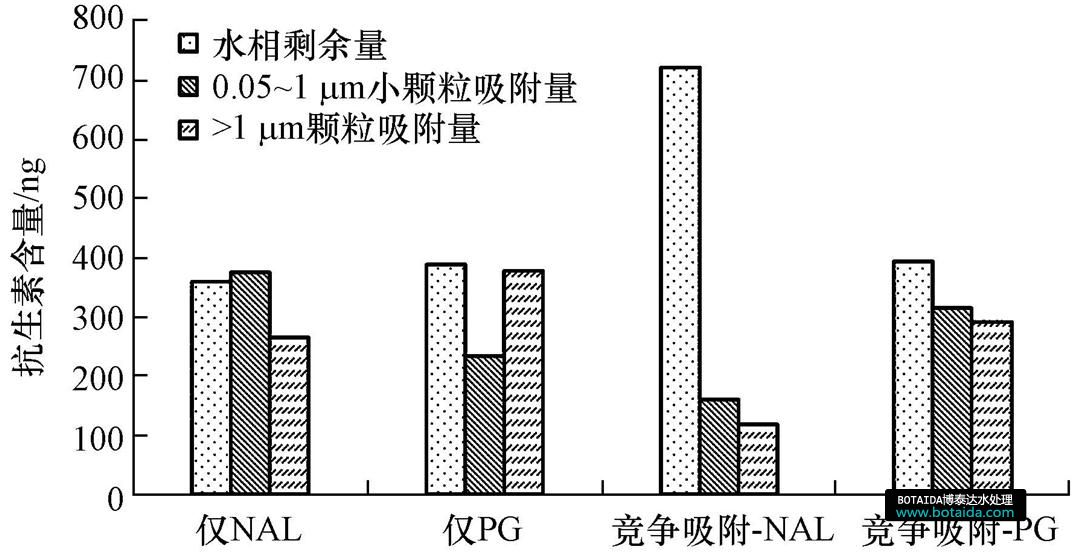 圖 1所示為萘啶酸(NAL)與青霉素G(PG)單獨(dú)存在及共同存在于水中的吸附實(shí)驗(yàn)結(jié)果.通過(guò)對(duì)比水相剩余量可知,當(dāng)萘啶酸和青霉素G同時(shí)存在時(shí),固體顆粒對(duì)青霉素G的吸附能力大于對(duì)萘啶酸的吸附能力.與抗生素單獨(dú)存在相比,萘啶酸的水相剩余量顯著增大,而青霉素G的水相剩余量則基本維持不變.可見(jiàn),青霉素G的存在很大程度地抑制了顆粒對(duì)萘啶酸的吸附,但顆粒對(duì)其自身的吸附量影響甚微.這同時(shí)說(shuō)明單一物質(zhì)存在時(shí),即使吸附達(dá)到平衡,顆粒上的吸附位點(diǎn)卻未飽和,顆粒的吸附能力并未達(dá)到最大.
