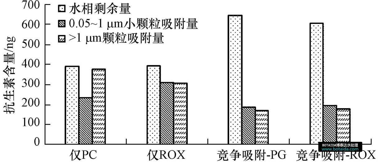 圖 6所示為青霉素G(PG)與羅紅霉素(ROX)單獨(dú)存在及共同存在于水中的吸附實(shí)驗(yàn)結(jié)果.顆粒上的吸附總量有一定增加,增幅在所有6種競(jìng)爭(zhēng)吸附中最小,這說(shuō)明二者同時(shí)投加時(shí)相互抑制的現(xiàn)象比較明顯.具體到小顆粒的吸附能力及吸附量,二者降幅明顯且羅紅霉素降幅更大,競(jìng)爭(zhēng)吸附平衡后二者吸附量相當(dāng).小顆粒吸附總量由309.20 ng上升至379.48 ng,漲幅為22.8%,依然存在吸附未達(dá)飽和的現(xiàn)象.結(jié)構(gòu)上看,二者的活性基團(tuán)不同,不會(huì)造成吸附位點(diǎn)的競(jìng)爭(zhēng),而且相互之間不發(fā)生復(fù)合反應(yīng),不影響抗生素本身的組成,但可能由于羅紅霉素分子量較大,占用空間較大,因此,產(chǎn)生了二者顆粒上的吸附量均減少但總量增多的結(jié)果.