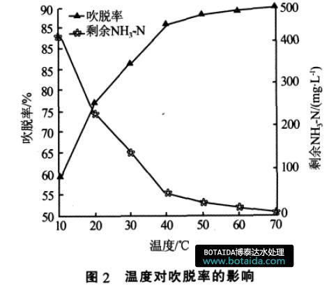 由圖2 可知,廢水溫度<40 ℃時,增加溫度可顯著提高廢水氨氮的吹脫率,但當(dāng)溫度>40 ℃后,溫度變化對吹脫率的影響明顯減弱, 因此將廢水溫度控制在40 ℃左右較適宜,此時吹脫率可達95%以上。
