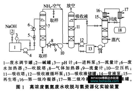 一定濃度的氨氮廢水在調(diào)節(jié)罐內(nèi)用固體NaOH調(diào)節(jié)pH 后,經(jīng)加熱器預(yù)熱后進入吹脫塔頂部,經(jīng)預(yù)熱的空氣由吹脫塔底部進入, 吹脫后的廢水由塔底排入收集瓶。吹脫塔頂出來的吹脫氣進入吸收塔底部,在塔內(nèi)與塔頂進入的氨吸收液進行傳質(zhì),吸收后的吹脫尾氣由塔頂排出,吸收液循環(huán)使用。吸收液飽和后進入再生塔進行加熱再生, 再生后的吸收液回到吸收液儲罐循環(huán)使用; 再生塔出來的高濃度氨氣經(jīng)二級冷凝后可獲得質(zhì)量分數(shù)為10%以上的氨水。