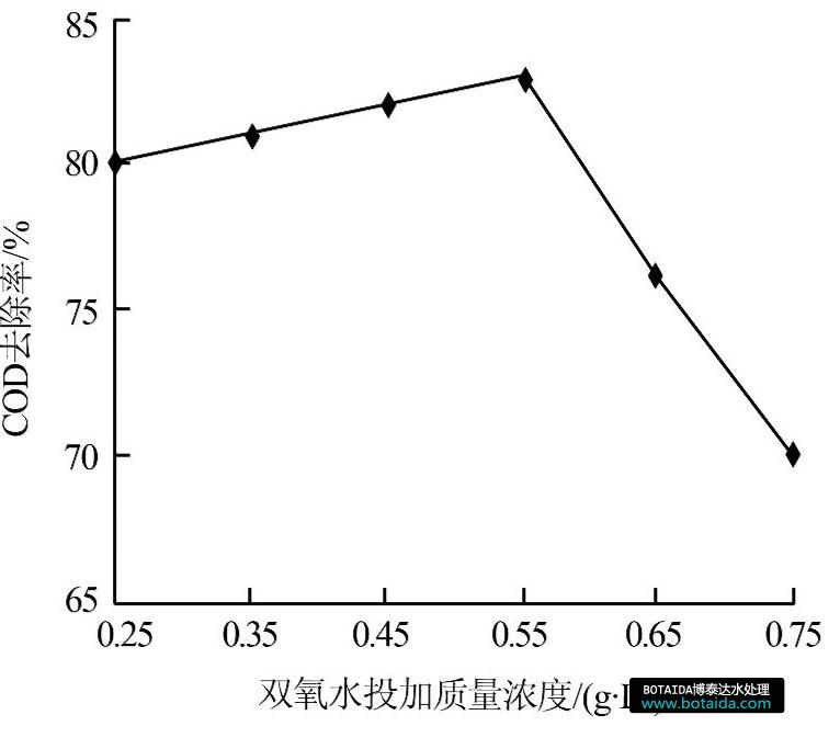 在pH=3.0,鐵炭總質(zhì)量濃度20 g/L,反應(yīng)時間40 min,MnO2投加質(zhì)量濃度為2.50 g/L,鐵炭比3∶1條件下,分別加入0.25、0.35、0.45、0.55、0.65、0.75 g/L H2O2進(jìn)行實(shí)驗(yàn),考察H2O2對微電解處理廢水體系的催化作用,結(jié)果如圖3所示。