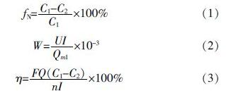 COD:Hach試劑法;氨氮:Hach試劑法;堿度:鹽酸滴定法;硬度:EDTA滴定法;氯離子:硝酸銀滴定法;電導(dǎo)率:電導(dǎo)率儀測量;濁度:濁度計測量;pH:pH計測量;另外需要記錄的裝置運行參數(shù)包括流量、壓強、運行電壓、電流等。脫鹽率、耗電量、電流效率分別按照式(1)~式(3)計算。