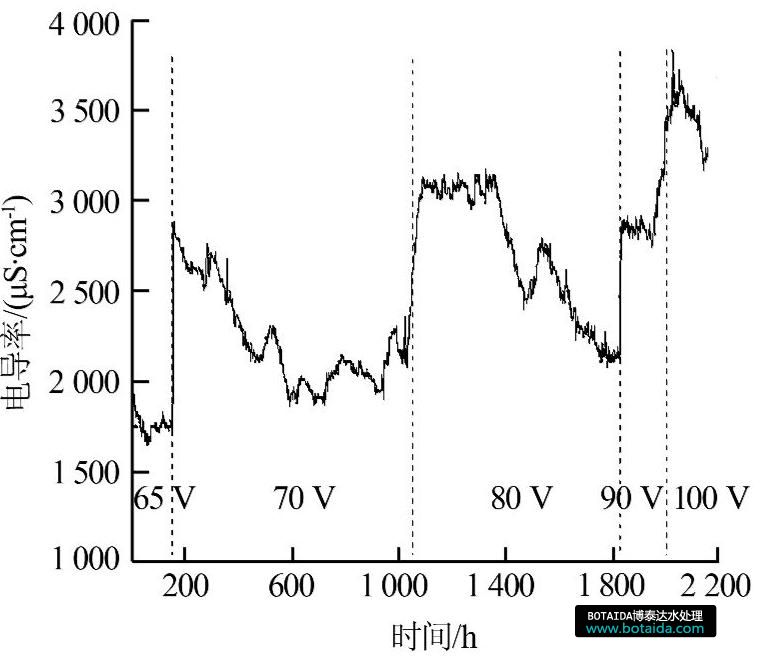 運行電壓隨進(jìn)水電導(dǎo)率變化趨勢見圖3。
