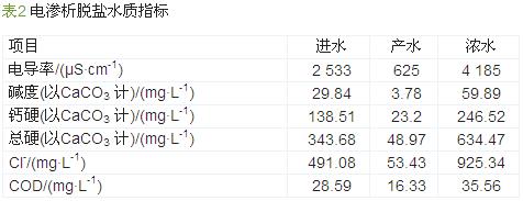 從表3可以看出,電滲析產(chǎn)水水質(zhì)滿足工業(yè)用水水質(zhì)要求,可回用于循環(huán)水補水系統(tǒng)中。