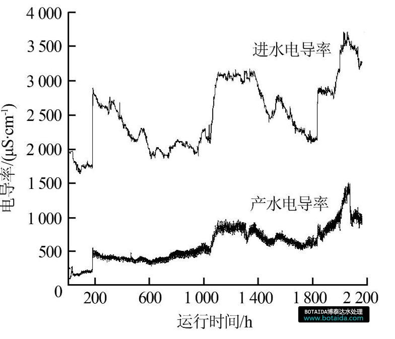 從圖4可以看出,在試驗前1 000 h內(nèi),產(chǎn)水電導(dǎo)率在500 μS/cm左右,到試驗后期產(chǎn)水電導(dǎo)率基本維持在1 000 μS/cm上下。
