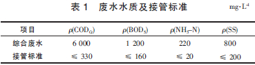 醫(yī)藥中間體生產(chǎn)廢水由工藝廢水和生活污水2部分組成,綜合廢水水質(zhì)指標(biāo)均為平均值,排放標(biāo)準(zhǔn)執(zhí)行當(dāng)?shù)貓@區(qū)污水處理廠的接管標(biāo)準(zhǔn)。廢水水質(zhì)及接管標(biāo)準(zhǔn)見(jiàn)表1。廢水產(chǎn)生量約為260 m3/d,設(shè)計(jì)處理量為300 m3/d。