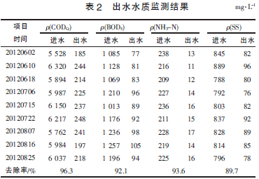 系統(tǒng)經(jīng)過(guò)2個(gè)月調(diào)試后,各項(xiàng)測(cè)試指標(biāo)均達(dá)到污水處理廠的接管標(biāo)準(zhǔn)。運(yùn)行結(jié)果表明,該系統(tǒng)運(yùn)行穩(wěn)定,抗沖擊負(fù)荷能力強(qiáng)。環(huán)保部門抽檢及企業(yè)自檢結(jié)果顯示,廢水各項(xiàng)指標(biāo)均穩(wěn)定達(dá)標(biāo)。近期運(yùn)行數(shù)據(jù)見(jiàn)表2。由表2 可見(jiàn),廢水經(jīng)過(guò)“預(yù)處理-UASB-二級(jí)接觸氧化”工藝處理后,平均去除效率分別為CODCr96.3%,BOD5 92.1%,NH3-N 93.6%,SS 89.7%,出水監(jiān)測(cè)指標(biāo)均優(yōu)于接管標(biāo)準(zhǔn)。