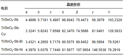 通過XRD分析軟件(X′Pert highscore plus)對數(shù)據(jù)進行分析(晉勇等,2008)得到各電極的晶胞參數(shù)見表 1,分析表中數(shù)據(jù)發(fā)現(xiàn),對Ti/SnO2-Sb電極進行金屬摻雜改性后,晶胞參數(shù)發(fā)生改變,主要體現(xiàn)在晶胞體積的增大或減小,這是由于各金屬離子成鍵半徑不同,當(dāng)金屬離子以固溶或者類質(zhì)同相的形式取代Sn4+進入SnO2晶格內(nèi)部,必然引起金屬氧鍵的鍵長發(fā)生變化,從而造成晶胞參數(shù)的改變.XRD圖譜和晶胞參數(shù)等數(shù)據(jù)表明,通過金屬摻雜改性使金屬離子進入到SnO2晶格中,其中,Cu和Ni以其p型半導(dǎo)體的性質(zhì)形成了空穴點位(劉淼等,2013),使電極表面形成較為密集的蜂窩狀,微觀結(jié)構(gòu)(圖 1)中也觀察到電極無裂縫且蜂窩狀結(jié)構(gòu)分布均勻,這樣的結(jié)構(gòu)可以增加電極的活性點位而提高電催化性能;而Bi則為n型半導(dǎo)體,與SnO2有著相似的性質(zhì),進入SnO2晶格后主要通過增加自由電子的濃度來達到增強導(dǎo)電能力的效果.