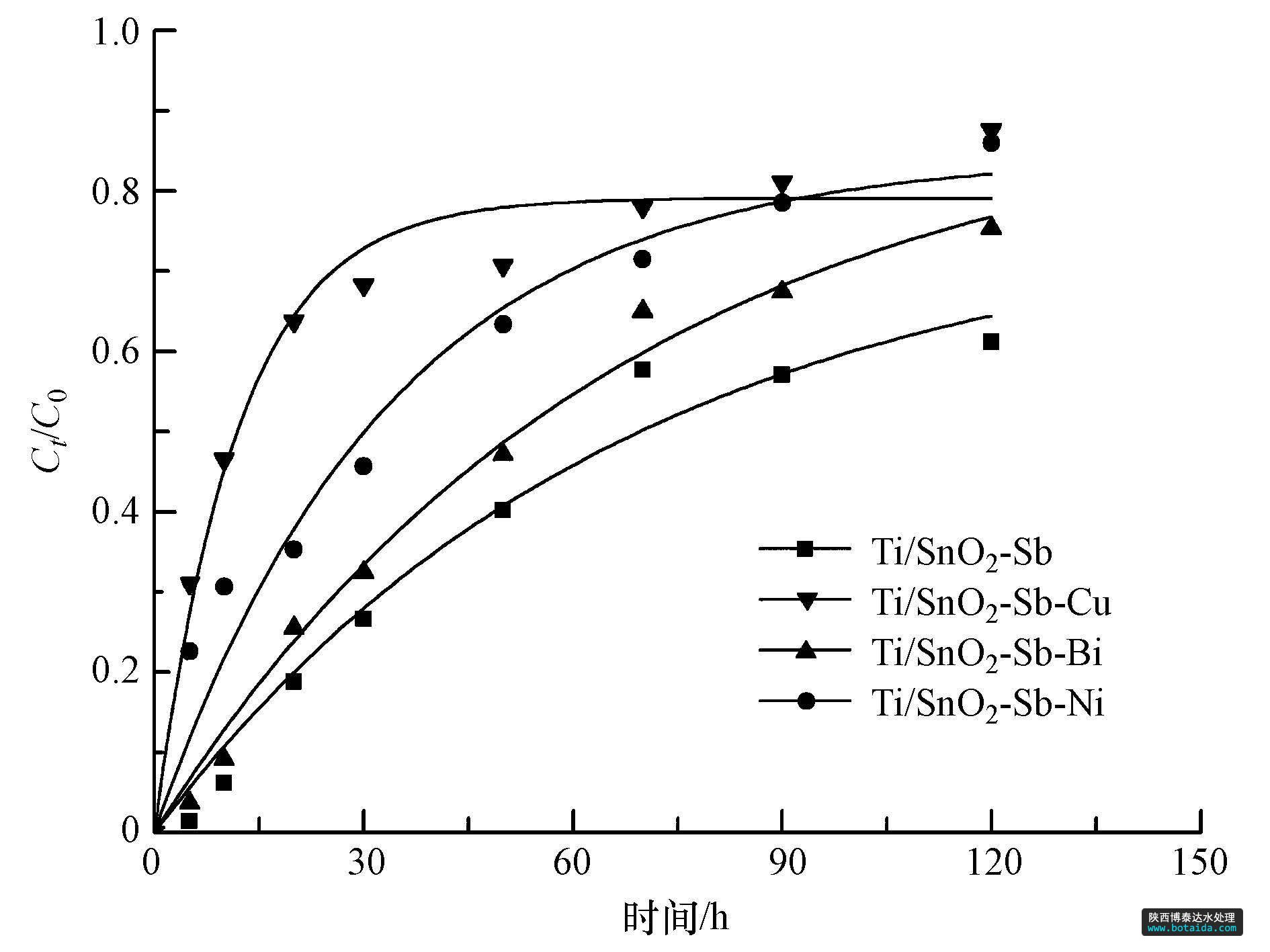在自制電解槽中,以1,4-二氯苯為目標(biāo)降解物,加入濃度為100 mg · L-1的廢水,同時添加3.55 g的Na2SO4作為支持電解質(zhì),以摻雜不同金屬的Ti/SnO2-Sb電極作陽極,石墨作陰極,通過磁力攪拌裝置控制一定的攪拌速率,恒定電壓為15 V,板間距1 cm,分別測定不同時間1,4-二氯苯的降解情況.1,4-二氯苯的測定采用高效液相色譜法.