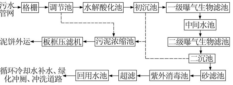 由于污水處理后主要供循環(huán)冷卻水系統(tǒng)補(bǔ)水,對(duì)水質(zhì)要求較高。水解酸化工藝可提高污水的可生化性。曝氣生物濾池(BAF)集生物氧化、截留懸浮固體為一體,具有抗沖擊負(fù)荷能力強(qiáng)、污泥產(chǎn)量較少、出水水質(zhì)穩(wěn)定等特點(diǎn)〔1, 2〕。超濾在過(guò)濾微細(xì)懸浮物及膠體物質(zhì)方面具有良好的效果〔3, 4〕,因此采用水解酸化—曝氣生物濾池—超濾組合工藝進(jìn)行處理,工藝流程如圖 1所示。從流程上分為3個(gè)部分: 預(yù)處理工藝、生化處理工藝和深度處理工藝。其中生化處理工藝為水解酸化—兩級(jí)曝氣生物濾池工藝,深度處理工藝為超濾工藝。