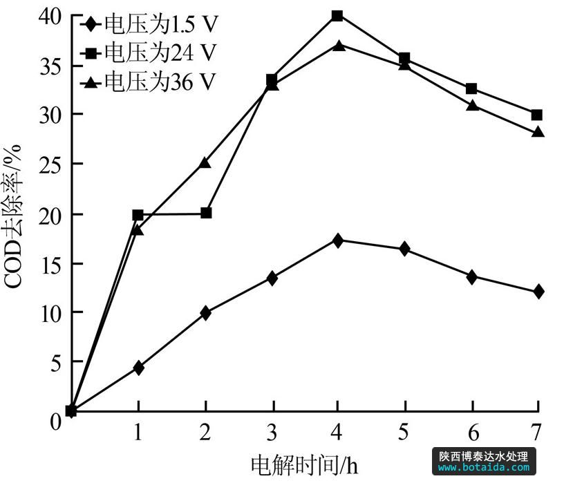 取極板間距為1.0 cm,實測垃圾滲濾液pH為8.37,電解電壓分別為1.5、24、36 V,每隔1 h取1次水樣,測定電解后滲濾液的COD,結(jié)果如圖 4所示。