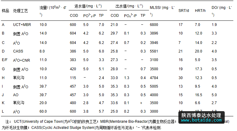 實驗所用的污泥樣品分別采集于9個污水處理廠,其中有2個水廠各包含2個工藝,共11個工藝.每個工藝取1個污泥樣品.其中,針對A2O+纖毛狀生物膜(CNR)工藝取2個樣品,分別位于加膜區(qū)和無膜區(qū),是為了考察加膜對聚磷菌的菌群結(jié)構(gòu)是否有影響,因此,共有12個樣品.12個樣品依次命名為A、B、C、D、E、F、G、H、I、J、K和L.其中,B和C取自同一水廠,I和J取自同一水廠,E和F取自A2O+纖毛狀生物膜工藝的加膜區(qū)和無膜區(qū).污水處理廠的運行參數(shù)及進出水指標(biāo)見表 1.