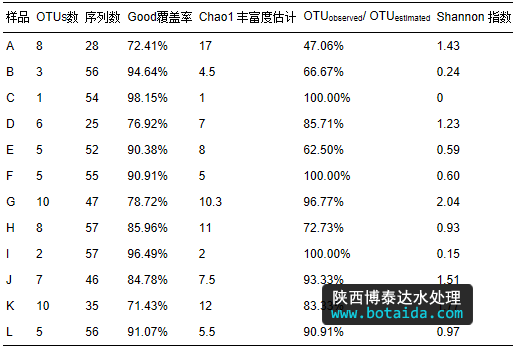 9個污水處理廠,共12個樣品,構(gòu)建12個ppk1基因克隆文庫進行分析.12個克隆文庫的Good 覆蓋率、Chao1 豐富度估計、OTU 值與估計的 Chao1 值之比(OTUobserved/OTUestimated)、香農(nóng)指數(shù)見表 4.12個污泥樣品的ppk1基因的OTUs分布如圖 3所示.如表 4所示,12個樣品的Good覆蓋率變化范圍為71.43%~98.15%.計算的 OTU 值與估計的 Chao1 值之比除了樣品A為47.06%,其余11個樣品在62%~100%之間.Mehlig等(2013)對國外8個污水處理廠進行了研究,Good覆蓋率只有35.4%~65.4%.說明本研究的12個克隆文庫可以代表 12個樣品中Accumulibacter的群落組成.樣品A可能需要測更多的數(shù)據(jù)保證數(shù)據(jù)的可信度.