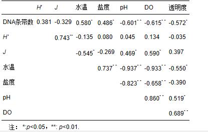 從浮游細(xì)菌與環(huán)境因子之間的相關(guān)關(guān)系可以看出,DNA指紋條帶數(shù)與環(huán)境因子密切相關(guān),其中與溫度和鹽度明顯正相關(guān)(p<0.05),而與pH、DO以及透明度明顯負(fù)相關(guān)(p<0.05或p<0.01),結(jié)果說明高溫高鹽可促進(jìn)浮游細(xì)菌多樣性,而pH、DO、透明度下降等水質(zhì)惡化現(xiàn)象則可降低浮游細(xì)菌的種類豐富程度.H′值僅與J值呈明顯正相關(guān);而J則與水溫明顯負(fù)相關(guān),與pH和DO明顯正相關(guān).各種環(huán)境因子之間幾乎均呈現(xiàn)出明顯的相關(guān)關(guān)系,其中水溫與pH、DO、透明度均明顯負(fù)相關(guān)(p<0.05或p<0.01),說明夏季水質(zhì)較冬季差;而DO又與pH和透明度明顯正相關(guān)(p<0.01).