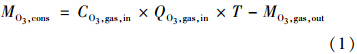 式中,MO3,cons為臭氧消耗量(mg);CO3,gas,in為反應(yīng)器入口的臭氧濃度(mg · L-1);QO3,gas,in為臭氧氣體流速(L · min-1),由氣體流量計測得;T為活性污泥臭氧氧化時間(min);MO3,gas,out為未參與反應(yīng)的臭氧量(mg).