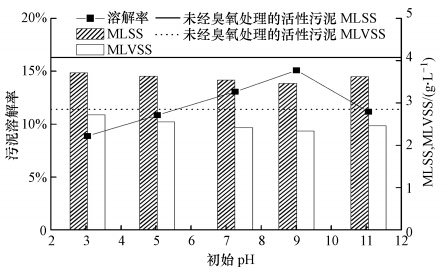 在污泥臭氧處理過程中,臭氧投加量和活性污泥的初始pH會影響污泥的溶解率及有機質(zhì)、氮、磷等物質(zhì)的溶出,從而影響污泥臭氧減量的效果.故合理的臭氧投加量和污泥初始pH不僅對污泥臭氧減量有利,而且可以提高工藝的經(jīng)濟性.