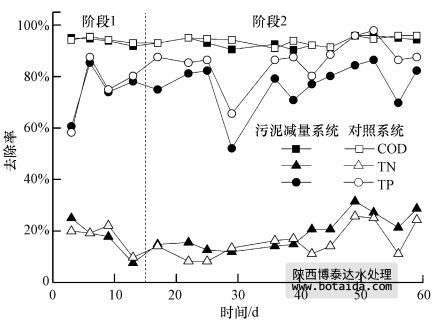 圖 5 污泥減量系統(tǒng)與對照系統(tǒng)中COD、TN和TP的去除率