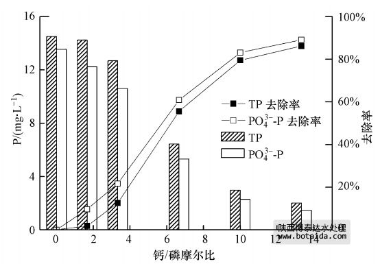 如前所述,當生物處理系統(tǒng)剩余污泥零排放時,出水中磷濃度將逐步升高,因此,需要增加除磷工藝,使出水TP達標.圖 7初步考察了鈣磷摩爾比對除磷效果的影響.由圖可知,隨著鈣磷摩爾比的增大,上清液中的TP和PO3-4-P逐漸降低,鈣磷摩爾比在3.3~10.0時,磷去除率增加較快,在0~3.3和10.0~13.3時,去除率增加較緩.鈣磷摩爾比在10.0以上時,TP和PO3-4-P的去除率均超過80%.