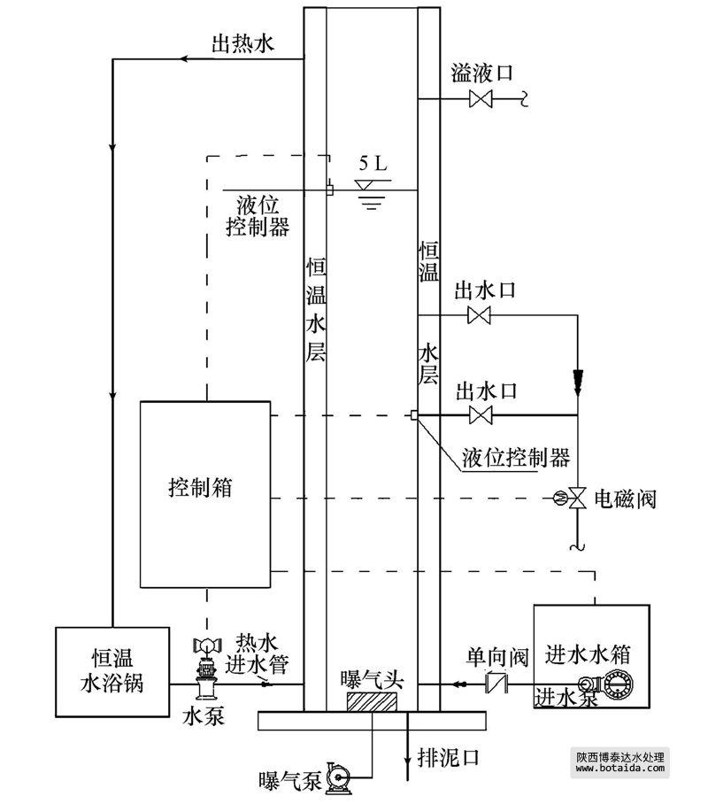 反應(yīng)器有效容積5 L,內(nèi)徑為100 mm,總高850 mm(圖 1).SBR運行參數(shù):自控裝置控制運行周期,處理水量為2.5 L · 周期-1,每周期6 h,包括進(jìn)水5 min,曝氣240 min,靜沉75 min,排水10 min,靜置30 min;溫度(25.0±0.5)℃.進(jìn)水水箱中設(shè)有循環(huán)泵,確保進(jìn)水成份均勻.曝氣時控制反應(yīng)器內(nèi)DO≥2 mg · L-1.實驗過程中平均1天排1次泥,保證MLSS為5000 mg · L-1左右,污泥齡約為6 d.