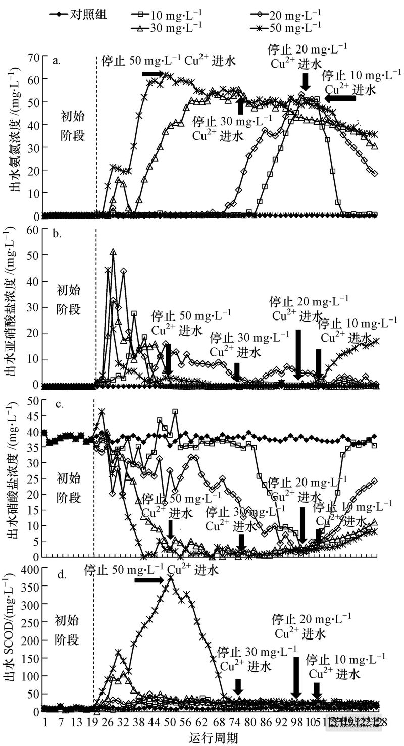 試驗采用5個相同的SBR反應(yīng)器進(jìn)行持續(xù)負(fù)荷試驗.其中1個反應(yīng)器為對照體系,進(jìn)水始終為不含Cu2+的模擬污水.另外4個反應(yīng)器在第1~20周期內(nèi)的進(jìn)水為不含Cu2+的模擬污水,該階段為初始階段;第21周期后,4個反應(yīng)器的進(jìn)水變?yōu)楹珻u2+濃度分別為10、20、30和50 mg · L-1的模擬污水,該階段為抑制階段;當(dāng)各反應(yīng)器的出水NH+4-N保持穩(wěn)定后,停止向進(jìn)水中加Cu2+,系統(tǒng)進(jìn)入恢復(fù)階段.