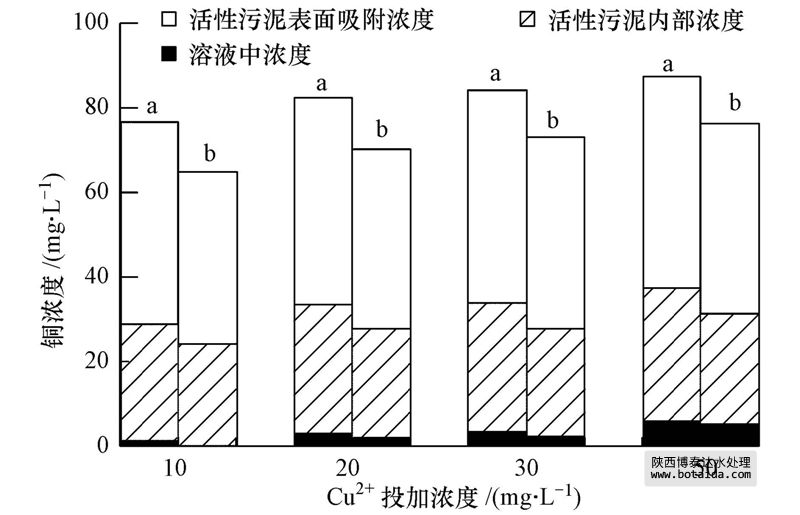 反應(yīng)器體系內(nèi)的總銅、溶解態(tài)銅、活性污泥內(nèi)部的銅、活性污泥表面吸附的銅可以反映銅在體系內(nèi)的分布,結(jié)合硝化作用的抑制可分析出銅對硝化細(xì)菌的影響.測定活性污泥內(nèi)部的銅主要運用洗脫液(1 mmol · L-1 EDTA,pH=7.0,0.1 mol · L-1 NaCl)洗脫泥樣后測定的方法.洗脫液使活性污泥表面吸附的銅解吸附,洗脫后殘留在泥樣內(nèi)的銅被認(rèn)為是進(jìn)入細(xì)胞內(nèi)部的銅.將用洗脫液洗脫后的泥樣、過濾后的水樣、泥水混合樣加酸進(jìn)行微波消解后,用火焰原子吸收儀測定銅的濃度,分別得到活性污泥內(nèi)部的銅、溶解態(tài)銅、總銅含量.總銅減去溶解態(tài)銅和活性污泥內(nèi)部的銅后可得到活性污泥表面吸附的銅.