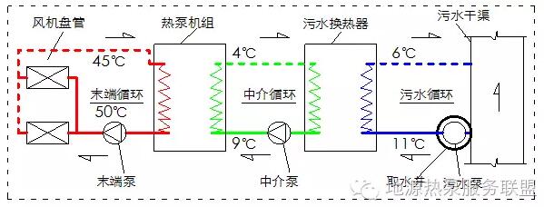 為應(yīng)對(duì)污水或地表水水質(zhì)條件,目前的系統(tǒng)多采用間接式系統(tǒng)。先將污水或地表水的熱量傳遞給清潔水,再由清潔水進(jìn)入熱泵機(jī)組,清潔水在污水換熱器和熱泵機(jī)組之間形成封閉循環(huán),起中介熱量傳遞作用,我們將其稱之為“中介循環(huán)”,而污水或地表水的自身循環(huán)稱之為“污水或地表水循環(huán)”,末端系統(tǒng)循環(huán)水在熱泵機(jī)組與末端散熱設(shè)備之間循環(huán)則稱之為“末端循環(huán)”。