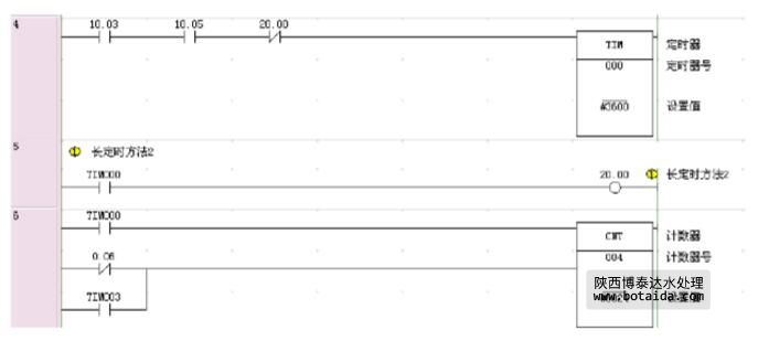 水處理系統(tǒng)所要達(dá)到的結(jié)果,這一段時間實(shí)現(xiàn)后,下面要實(shí)現(xiàn)的就是長定時的方法2,設(shè)置常開點(diǎn)TIM000,在常開點(diǎn)TIM000后接上線圈2000,這一小段程序雖然在整個污