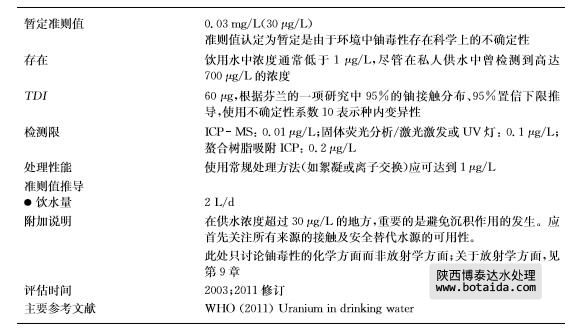 根據(jù)人群接觸高濃度鈾的新的流行病學(xué)研究推導(dǎo)的30μg /L的暫定準則值,代替原先 根據(jù)實驗動物研究推導(dǎo)的暫定準則值。被認定為是基于有關(guān)鈾的毒理學(xué)和流行病學(xué)上的不 確定性以及要實現(xiàn)更低濃度供應(yīng)在技術(shù)上的困難度。要注意的是,有關(guān)人類群體的研究如 可獲取且質(zhì)優(yōu),則為用于推導(dǎo)健康準則值相關(guān)信息的首選來源