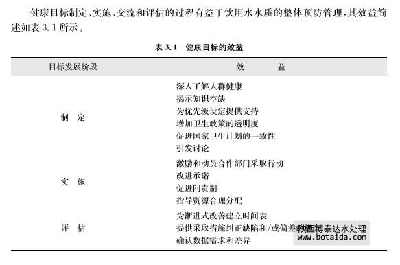 基于健康的目標(biāo)適用于各種發(fā)展水平的國(guó)家。為了確保有效保護(hù)和改善健康,設(shè)定的 目標(biāo)必須是現(xiàn)實(shí)的、可衡量的、基于科學(xué)的數(shù)據(jù)并與當(dāng)?shù)貤l件(包括經(jīng)濟(jì)、環(huán)境、社會(huì)和文化 條件)以及財(cái)政、技術(shù)和體制資源相適應(yīng)。健康目標(biāo)應(yīng)是整體公共衛(wèi)生政策的一部分,應(yīng)將 公眾衛(wèi)生現(xiàn)狀和趨勢(shì)、飲用水對(duì)于傳染性疾病傳播和有害化學(xué)品在個(gè)體水平和整個(gè)衛(wèi)生管 理中的作用考慮在內(nèi)。