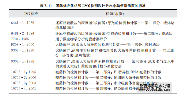 國際標準方法在被采納之前應根據(jù)當?shù)氐木唧w情況進行評估??梢允褂靡呀⒌臉藴?方法,如國際標準化組織(ISO)(見表7.11)的方法或效果及可靠性與其相當?shù)姆椒ň刹?用。對于常規(guī)檢測可采用那些已建立的方法。無論選用何種方法檢測埃希氏大腸桿菌或耐 熱性大腸菌群,都必須考慮因環(huán)境或消毒劑受到損傷的微生物菌株的“復蘇”或“恢復”問題。