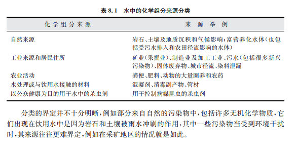 一般說(shuō)來(lái),以下兩種情況下,飲用水中化學(xué)危害的管理方法是不同的:污染物主要來(lái)自 飲用水的水源(主要通過(guò)控制污染物源頭,例如通過(guò)水源的選擇,水源污染控制、處理或混 合)以及污染物來(lái)自飲用水生產(chǎn)和輸配過(guò)程(通過(guò)優(yōu)化工藝過(guò)程或嚴(yán)格出水標(biāo)準(zhǔn)加以控制)。 因此,在本準(zhǔn)則中根據(jù)化學(xué)物質(zhì)主要來(lái)源分成5個(gè)組,見(jiàn)表8.1。