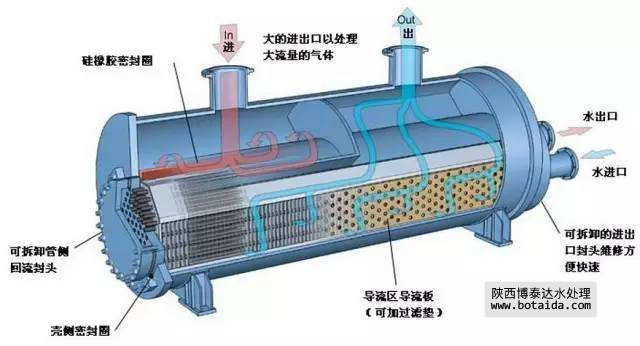 ② U形管式換熱器:它只有一塊管板,因此管子在受熱或冷卻時(shí),可以自由伸縮。這種換熱器的結(jié)構(gòu)簡(jiǎn)單,但制造彎管的工作量較大,且由于管子需要有一定的彎曲半徑,管板的利用率較差,管內(nèi)進(jìn)行機(jī)械清洗困難,拆換管子也不容易,因此要求通過(guò)管內(nèi)的流體是清潔的。這種換熱器可用于溫差變化大,高溫或高壓的場(chǎng)合。
