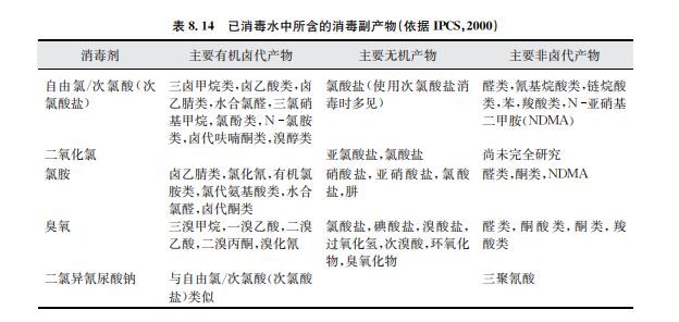 在水處理過(guò)程中,有些物質(zhì)是人為添加進(jìn)入水體的(直接添加物),有些物質(zhì)可能不受控 制地殘留在出水中(如鹽類、高分子絮凝劑殘留物或單體)。類似氯胺或自由氯的殘留屬于 有意添加,這些殘留對(duì)水質(zhì)保障有一定好處。其他物質(zhì),如消毒副產(chǎn)物,是在消毒劑與水中 通常存在的一些物質(zhì)相互起化學(xué)反應(yīng)過(guò)程中產(chǎn)生的(見(jiàn)表8.14)。氯化消毒副產(chǎn)物和其他消 毒副產(chǎn)物也可能會(huì)在游泳池用水中出現(xiàn),此時(shí)吸入和皮膚吸收途徑對(duì)人體接觸消毒副產(chǎn)物 更加重要(WHO,2006)。
