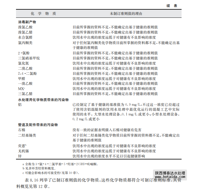 其他化學(xué)物質(zhì),如來(lái)自管道或銅質(zhì)龍頭的鉛或銅,以及從涂層溶出的化學(xué)物,可能是在 處理或輸配水過(guò)程中因水與其表面接觸而進(jìn)入水中(間接添加物)。 飲用水處理中使用的一些化學(xué)物質(zhì)(如鋁)或可能與水接觸的一些化學(xué)材料(如苯乙烯) 也許會(huì)從其他主要來(lái)源進(jìn)入水中,這些已在本章其他章節(jié)具體討論。