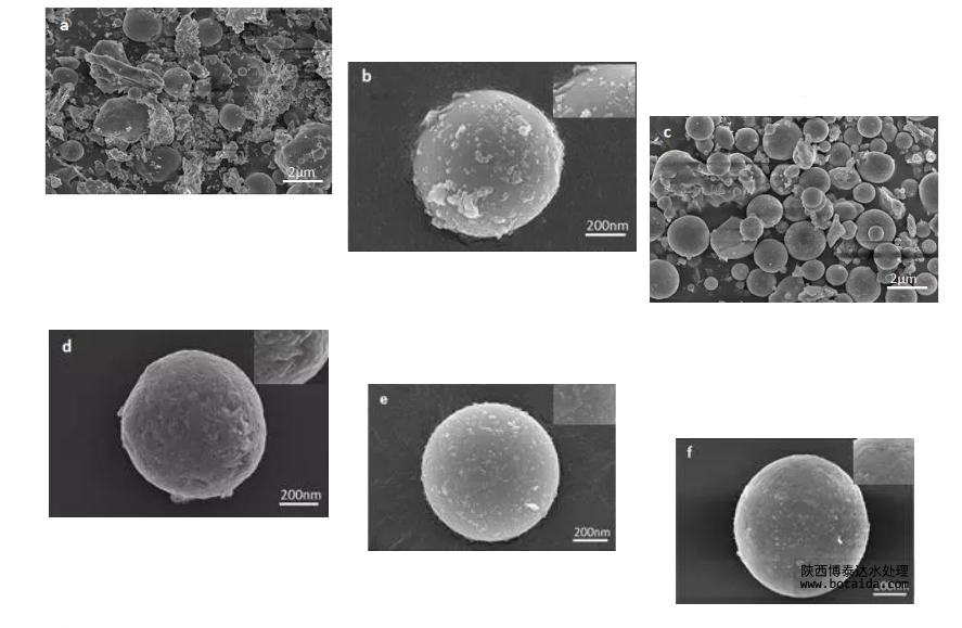 圖(e)-(g)分別是CTAB,PAM單改性和2.5gCTAB,0.05%PAM雙改性的掃描電鏡圖??梢钥闯鲈陬A(yù)處理后粗糙表面上分散吸附了部分CTAB和PAM,而并不是完全包裹,吸附的改性劑改變了粉煤灰的表面性質(zhì)。經(jīng)Zeta電位測(cè)定儀測(cè)量,原始粉煤灰的表面帶負(fù)電,Zeta電位為-10.4mV,HCl改性后Zeta電位為-21.3mV。CTAB,PAM單改性和雙改性后的粉煤灰表面帶正電,分別為+4.5mV,+6.8mV和+12.9mV,由于油分子表面帶負(fù)電荷,材料表面帶正電荷有利于油的吸附。